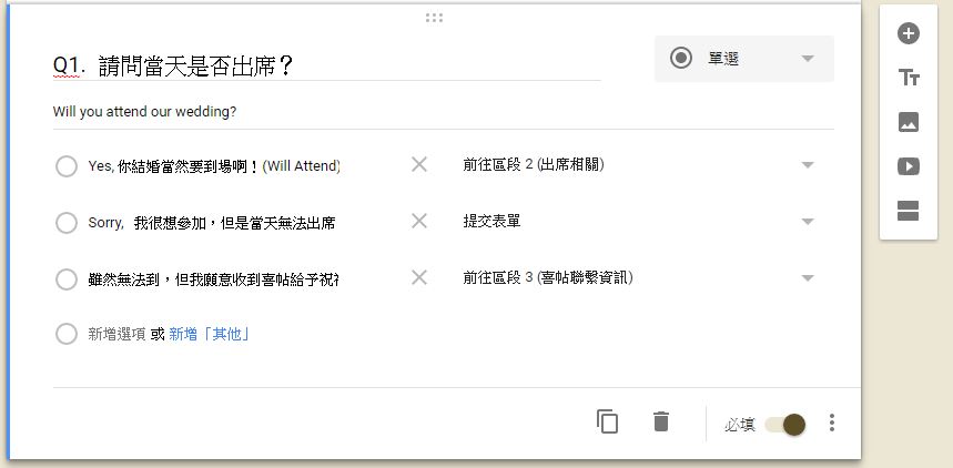 畢竟在美國主修過問卷調查,所有問題一定要是必填,以免造成日後新娘不方便,還要一個個去追問~
