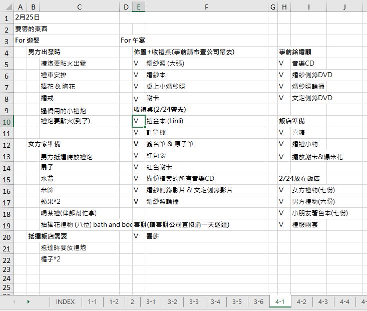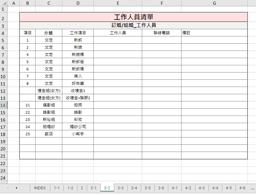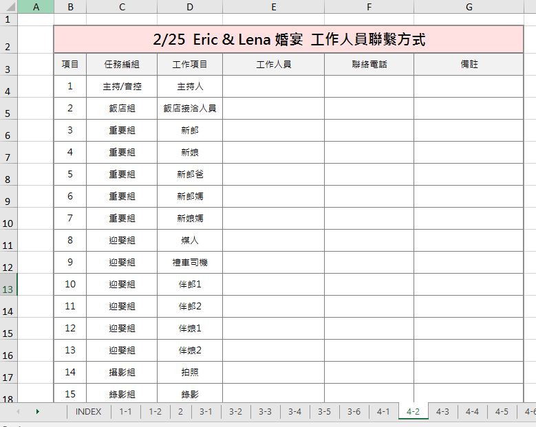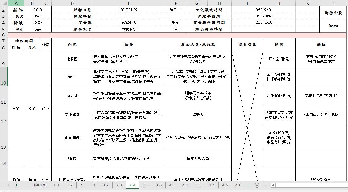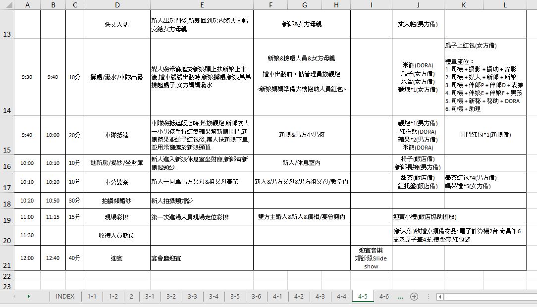 – 工作人員版的流程表:給總召、收禮金、招待、伴郎伴娘、雙方父母