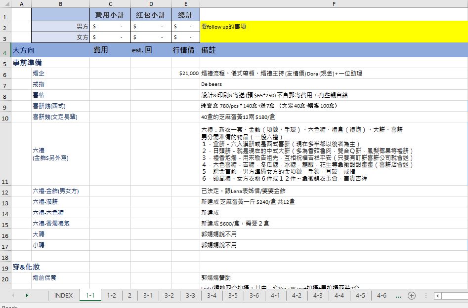– est.回:estimated 回收 = 禮金,這樣可以看大概要花多少錢