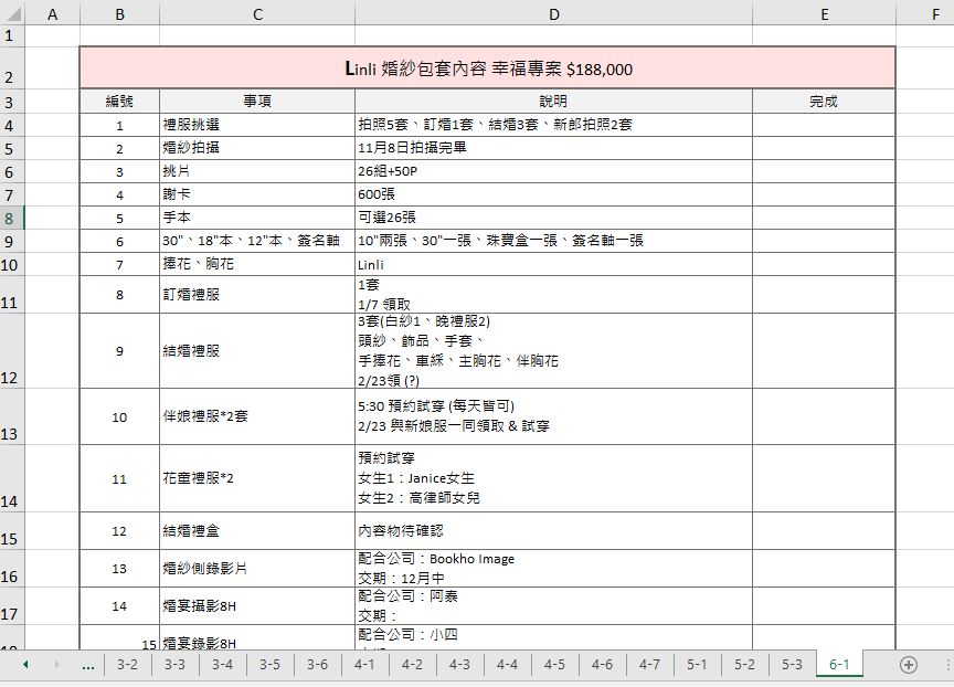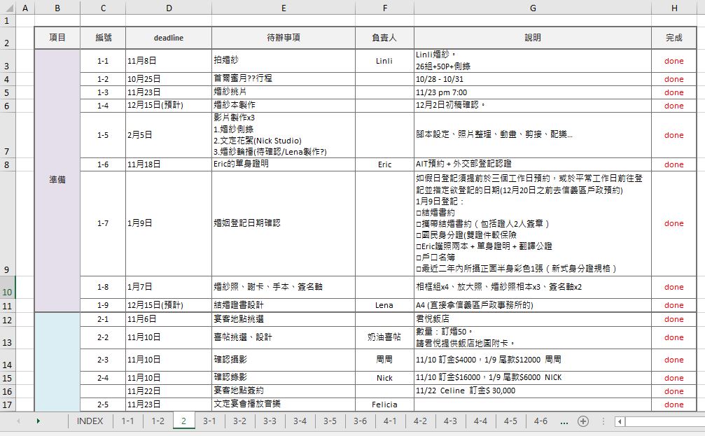 – 細分工作項目編號、deadline、代辦事項、負責人、說明、完成