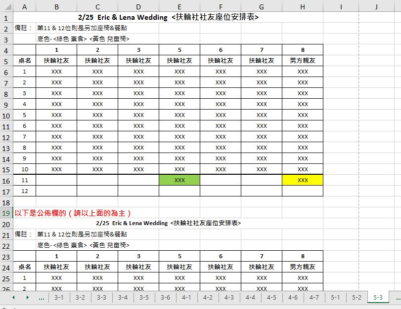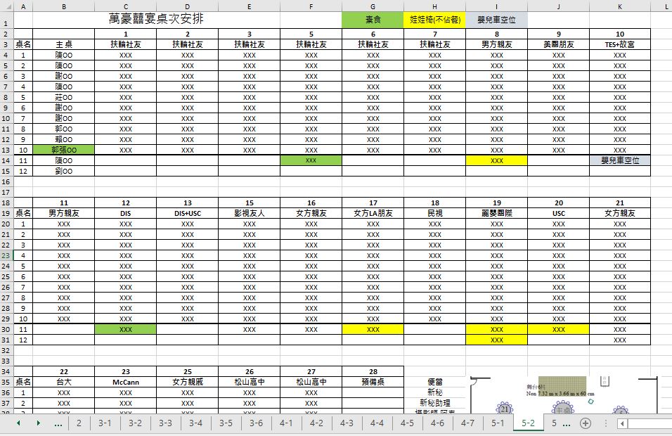 所以實際座位表 & 現場大張座位表 不同,因此給秘書兩份對照