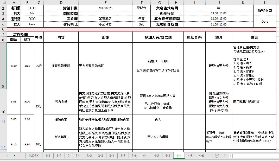 – 完整版的流程表:給攝影師、錄影師、新秘、飯店燈光音效控制、新娘小幫手、主持人