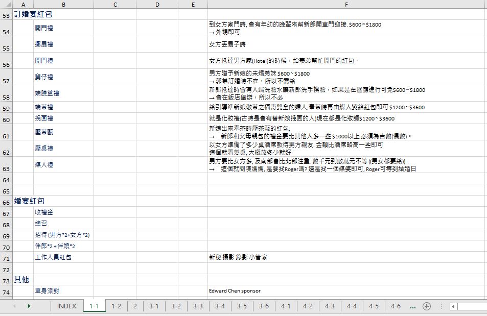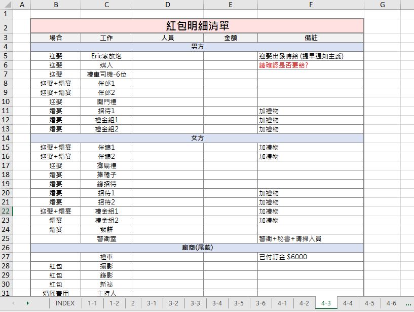 - 婚宴紅包:收禮金的紅包$、工作人員紅包…etc.