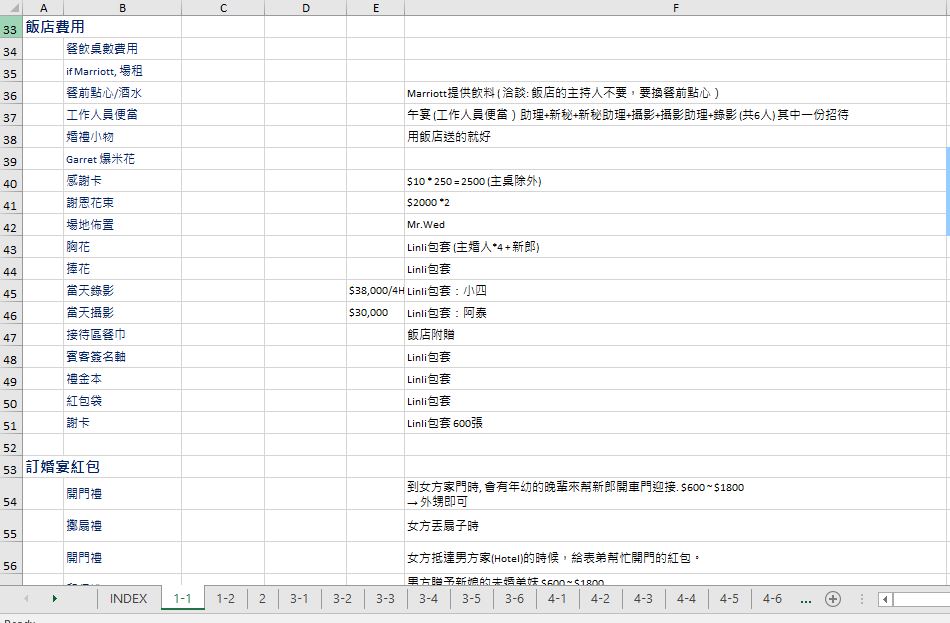 - 飯店費用:餐飲桌數費用、場租、餐前點心/酒水、工作人員便當、婚禮小物、場地布置