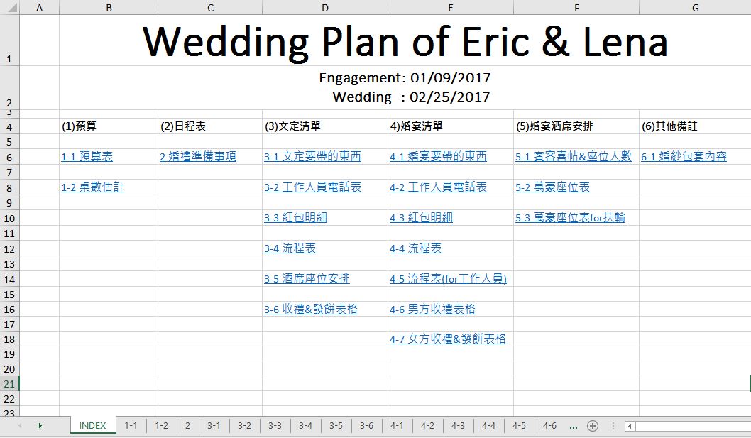 – 分成「準備」、「訂婚」、「結婚」三大部分