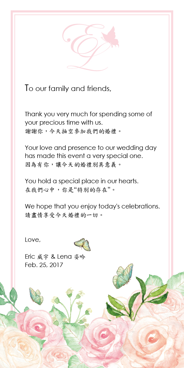 主要賓客有一半是外國人,一半是台灣人,所以我們選擇中英文都附上去,方便每位賓客看懂,這張卡片是最多賓客拍照並且帶走留念的東西,也很感謝Dora,在婚禮前三個星期才幫我臨時搞定這張卡片,大概晚上10點討論好,我半小時把內容文字搞定,隔天早上十點就收到稿子確認,整個速度很快!也符合我要的玫瑰、粉紅色、有蝴蝶的風格!