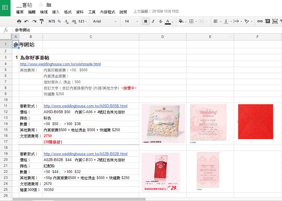 先列出公司、網站連結、其他費用(版費、運費、可否自訂文字的費用、信封燙金….etc.),最後在一個個款式列出來,找了幾家之後,我發現超多款式都重複的!甚至在淘寶就能找到,而且便宜超級多,當然相對可能會碰到簡體字。因為怕麻煩,也不想冒風險,所以決定直接在台灣訂購喜帖。
