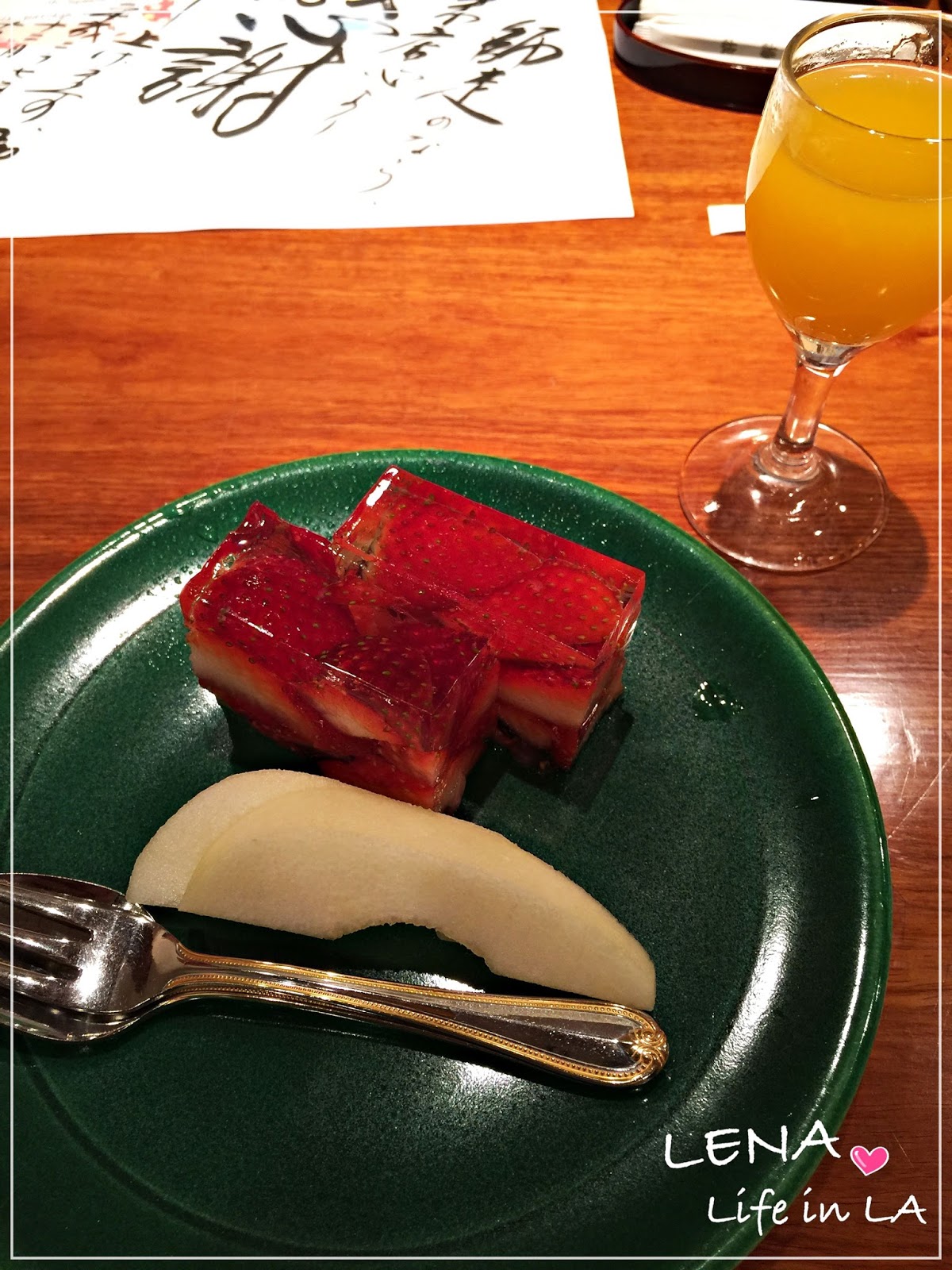 他家的料理,沒有一道不好吃的,印象深刻的是最後的甜品草莓果凍,綠色碟子盛著透明jelly,裡邊還嵌著兩顆草莓,超喜歡日本草莓的我,原本已經飽到不行的胃,立馬空出位置來囤放這股香甜。