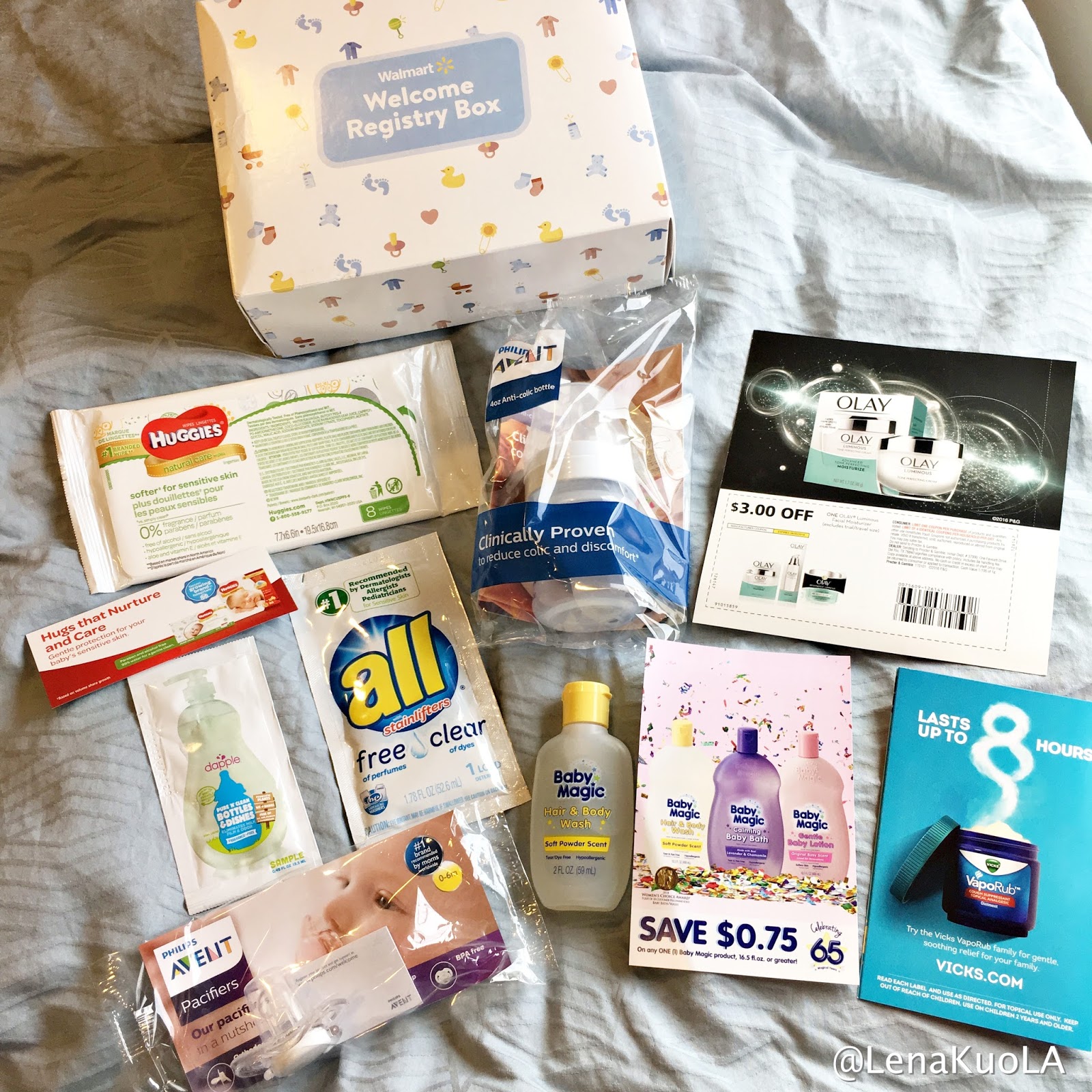- 可以上網查詢 Walmart Baby Box,大概就可以看到有哪些內容物囉!查了一下,也差不多是一樣的,小的奶瓶、奶嘴、沐浴乳試用包、溢乳墊、尿布試用一片、coupon券。