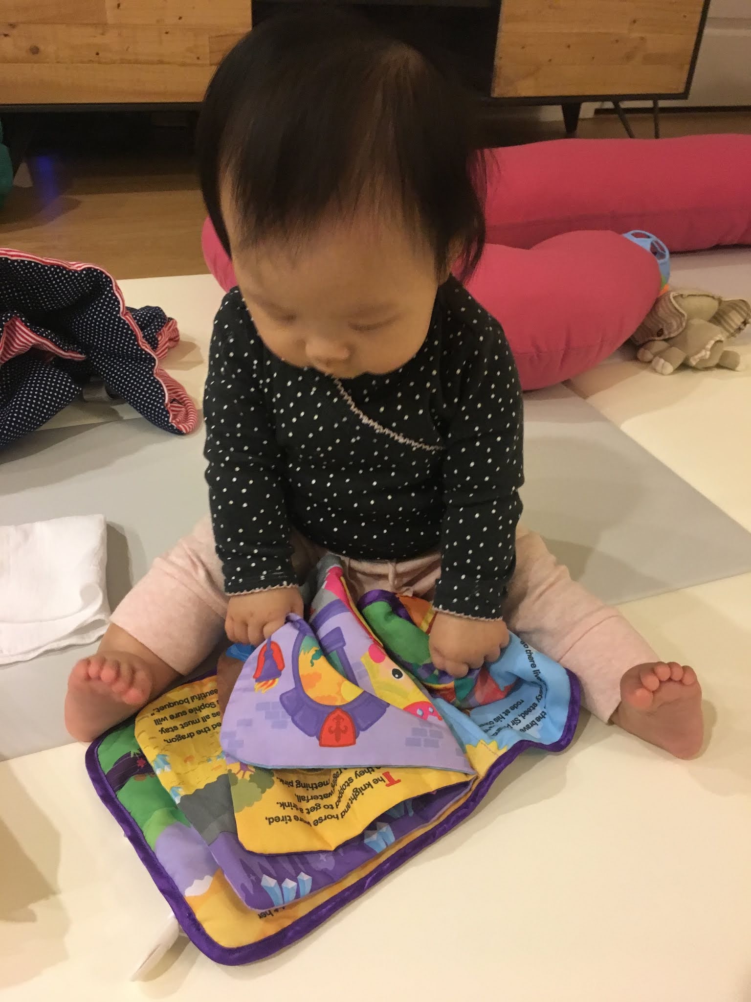 我自己兩胎的經驗,的確布書發出聲音時,90%可以吸引寶寶注意力,寶寶可以看得很專心