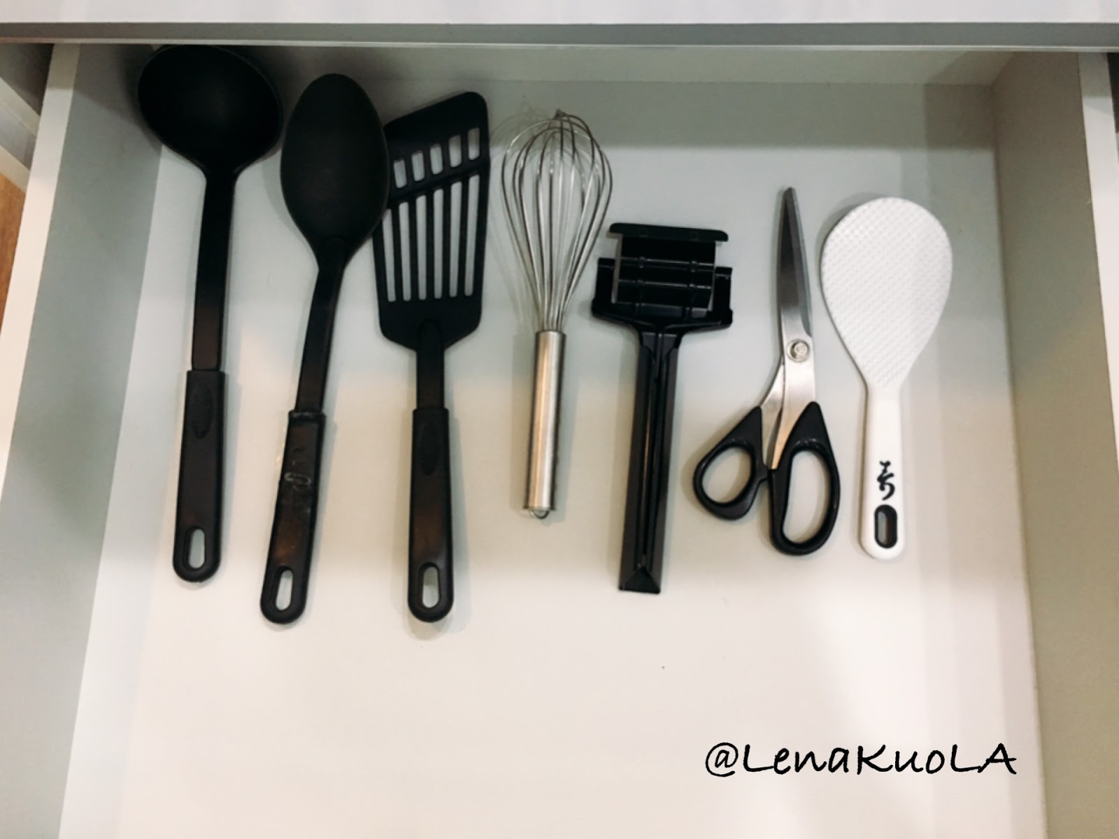 廚房的道具應有盡有,鍋碗瓢盆、湯匙、叉子、筷子(韓國那種扁筷)、刀具…都有。甚至還有開瓶器,杯子餐盤都是四入。飯匙、炒菜的各式鍋鏟、打蛋器也有。