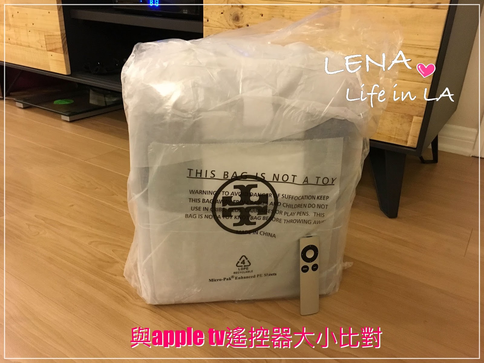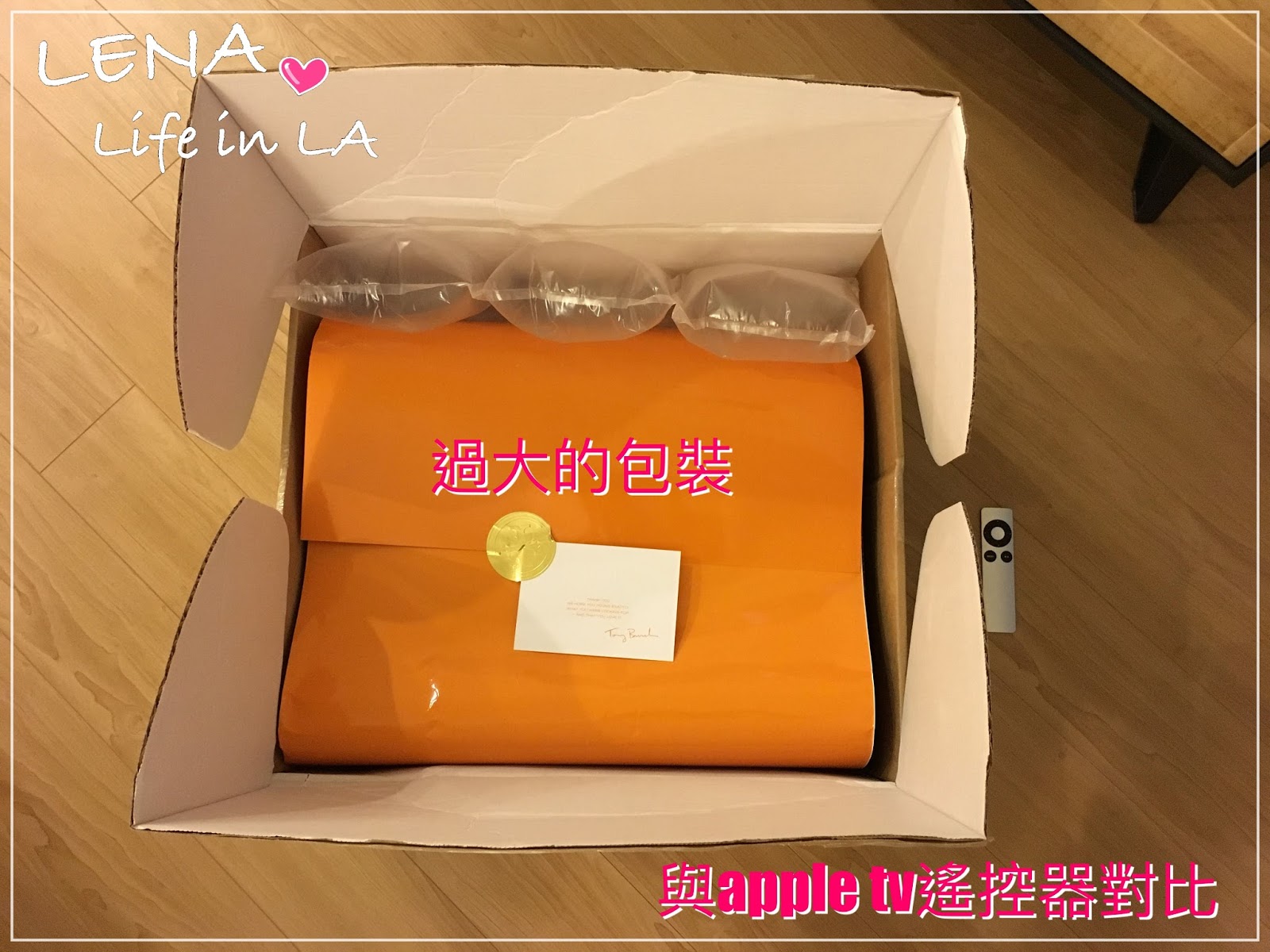 這是Tory Burch 的包包,紙箱(與 Apple TV 遙控器對比)