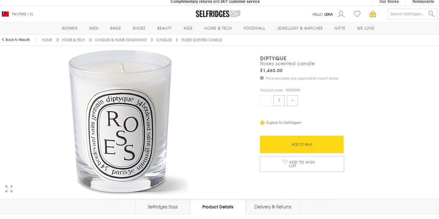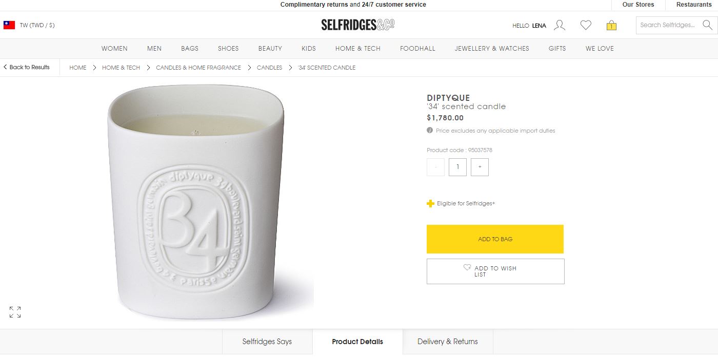 - Diptyque 聖日爾曼大道34號香氛蠟燭Selfridge 價格: NT. 1,780