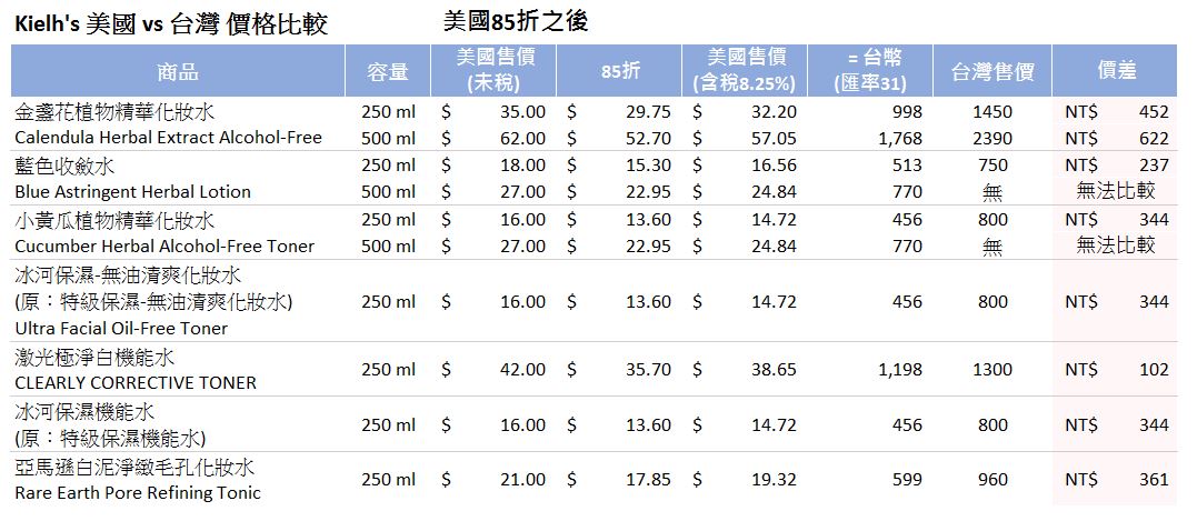 化妝水類:台灣專櫃的 5.7~6.2 折