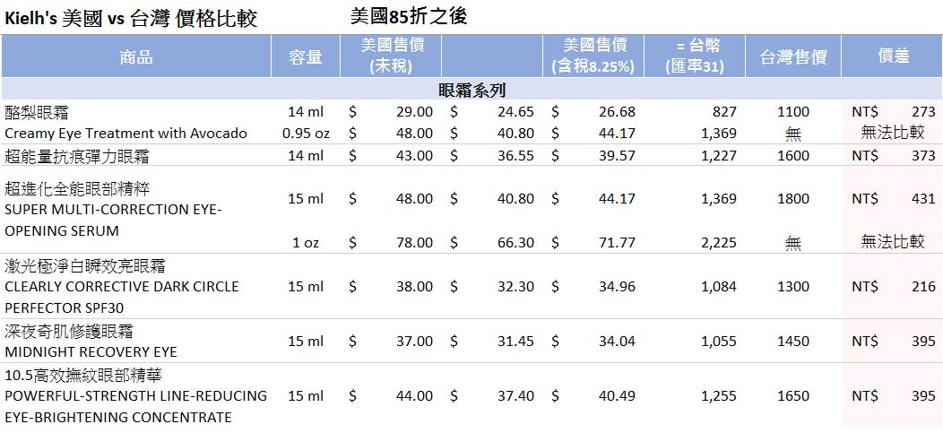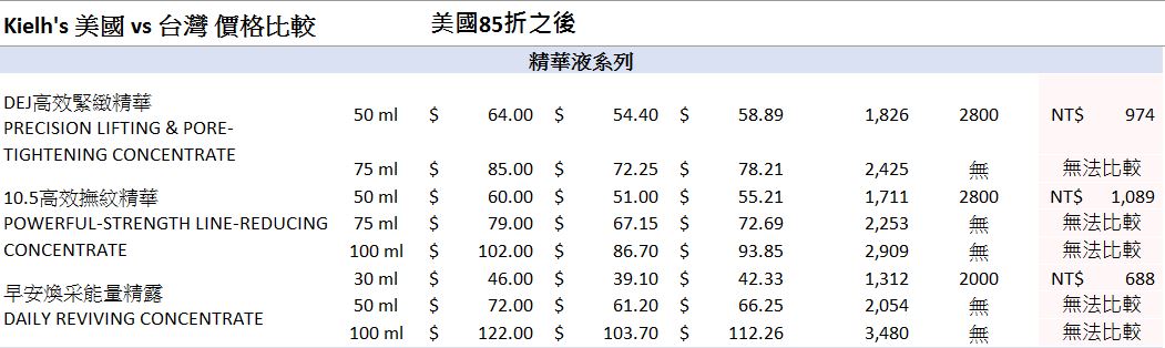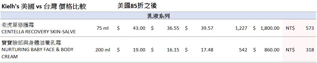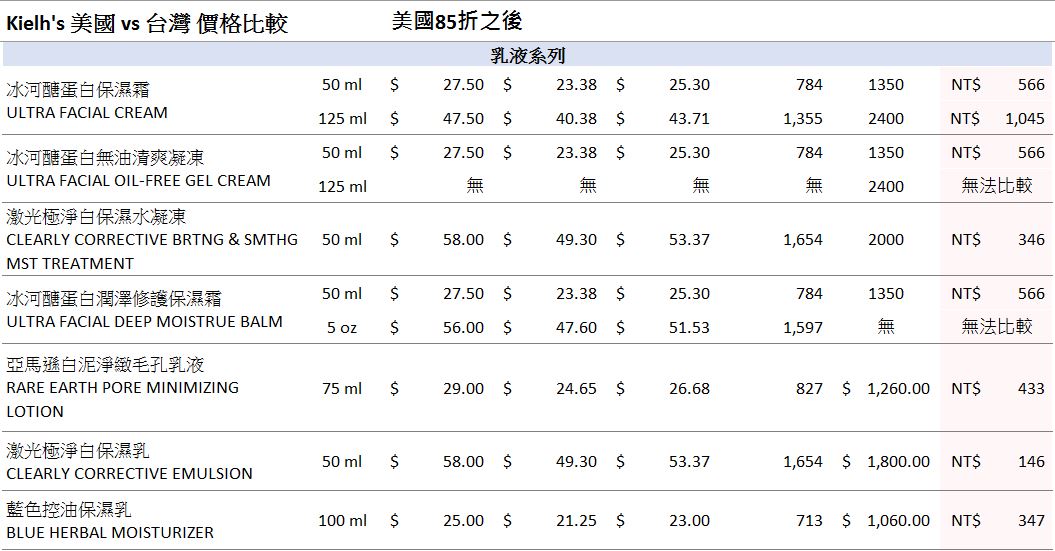 乳液類:台灣專櫃的 5.8 ~6.3折