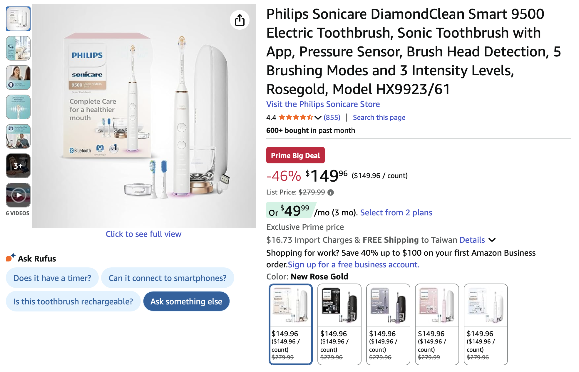◉ Philips Sonicare DiamondClean Smart 9500 電動牙刷 特價$149.96 + 關稅$18.59 = 約NT$4,853 (prime會員限定)