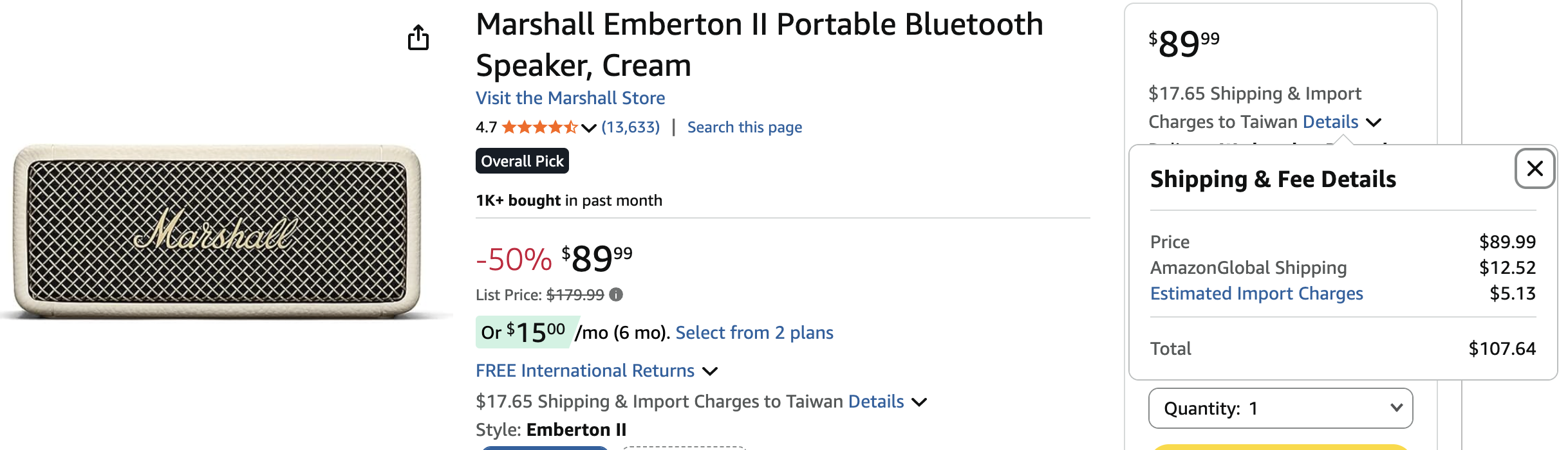 特價 $89.99 + 關稅$5.13+運費$12.52 =$107.64 =NT$3,369 (台灣$5,490) 58折