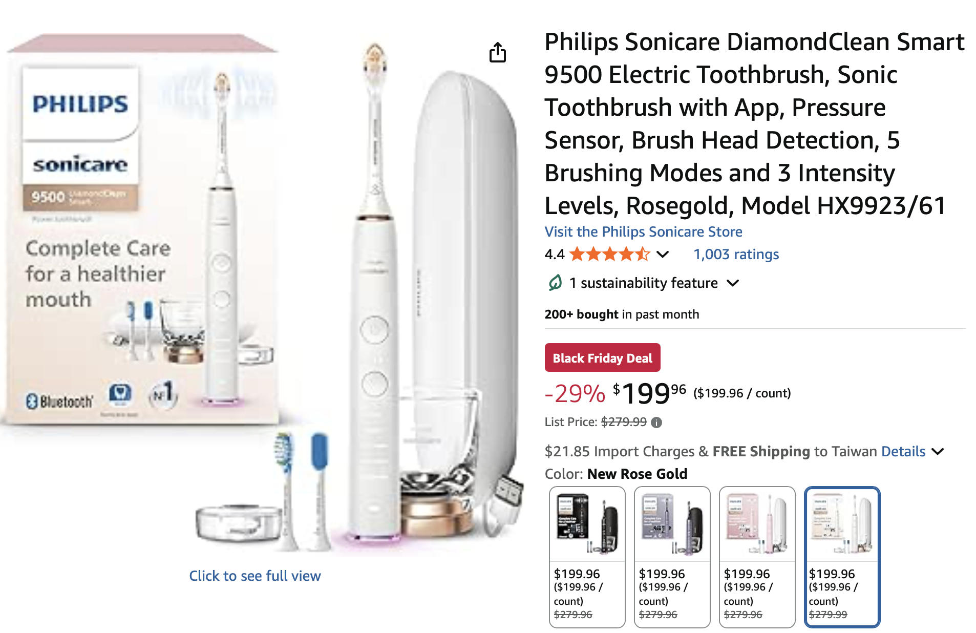 ◉ Philips Sonicare DiamondClean Smart 9500 電動牙刷 特價$199.96 + 關稅$21.85 = 約NT$6,944